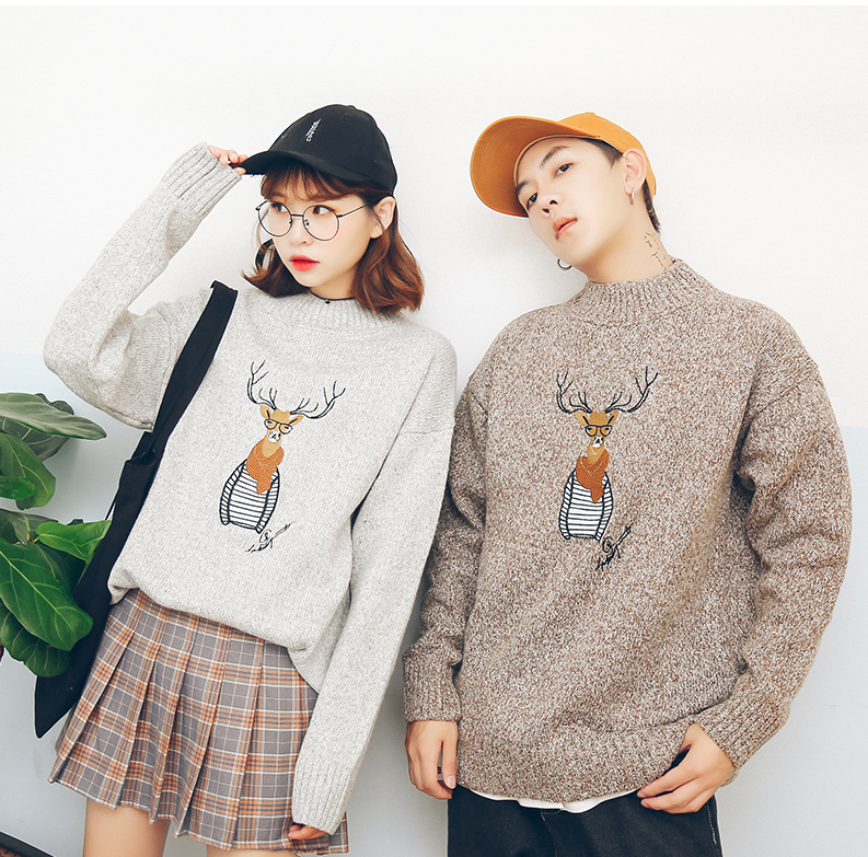 2018秋冬宽松套头麋鹿刺绣情侣毛衣韩版潮流个性高领针织衫