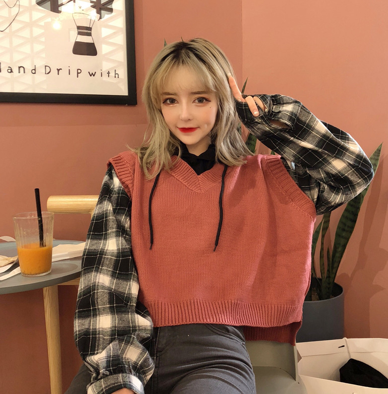 bf格子拼接假两件套套头针织衫长袖秋季2018新款女韩版宽松