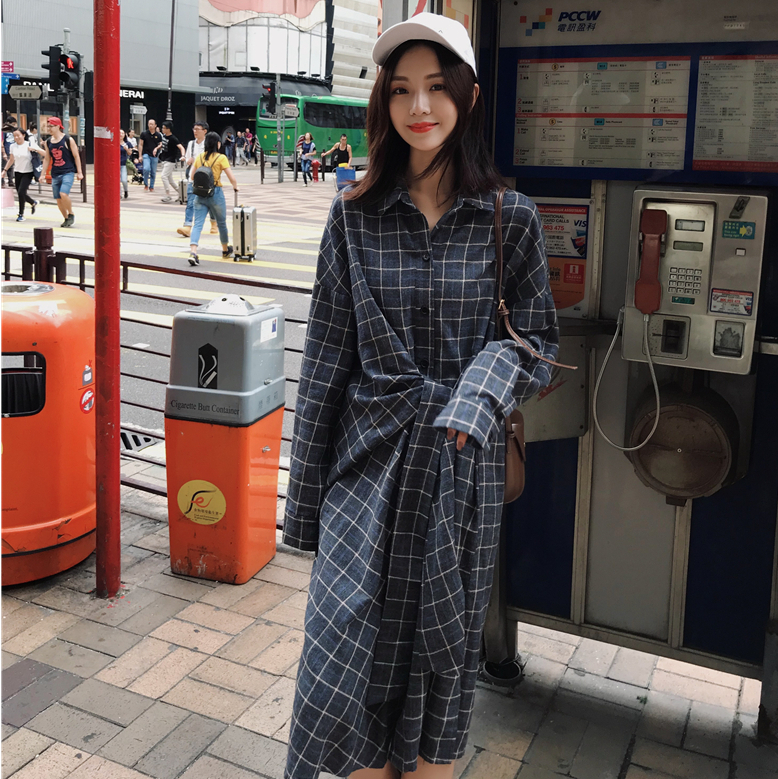 早秋长袖格子连衣裙女中长款2018新款修身衬衫群显瘦大摆长裙