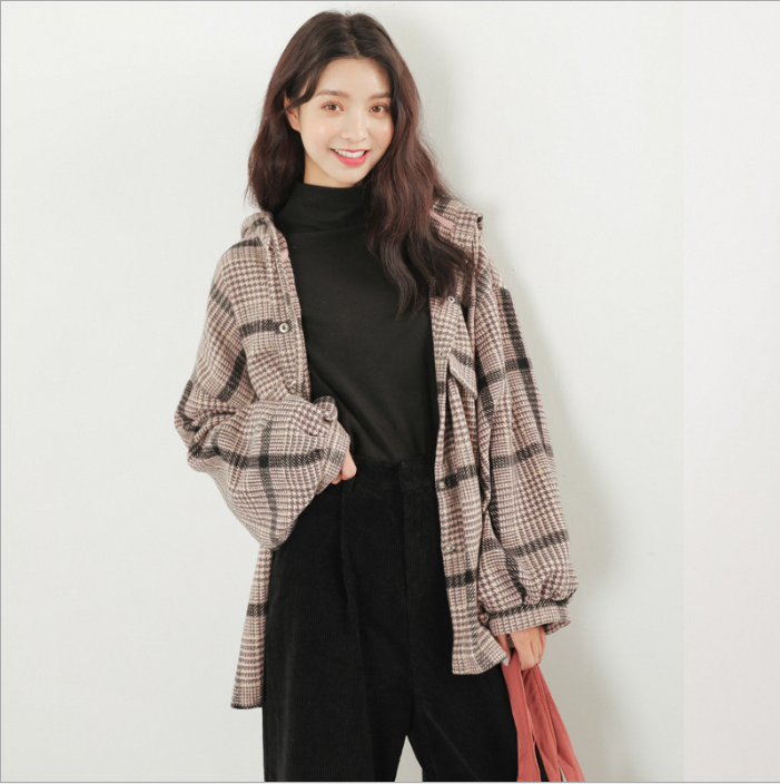 日系连帽格子衬衫外套BF宽松港风衬衣女2018早秋新款潮流文艺