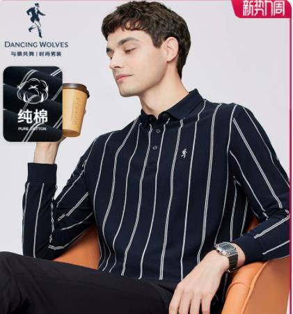 与狼共舞条纹翻领长袖T恤男2022秋季新款厚实百搭POLO衫