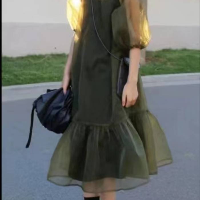 夏装2022年新款小个子女初恋长款过膝墨绿色连衣裙