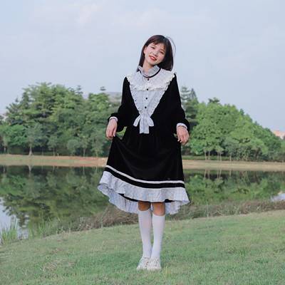 原宿自制丝绒格子连衣裙轻秋季女显瘦