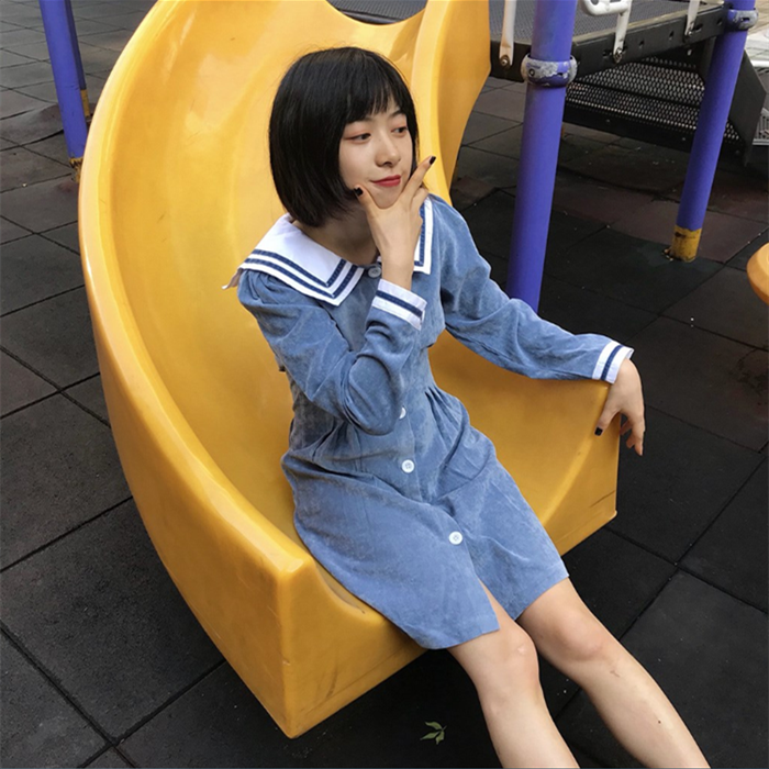 雾霾蓝色连衣裙长袖2018秋季新品