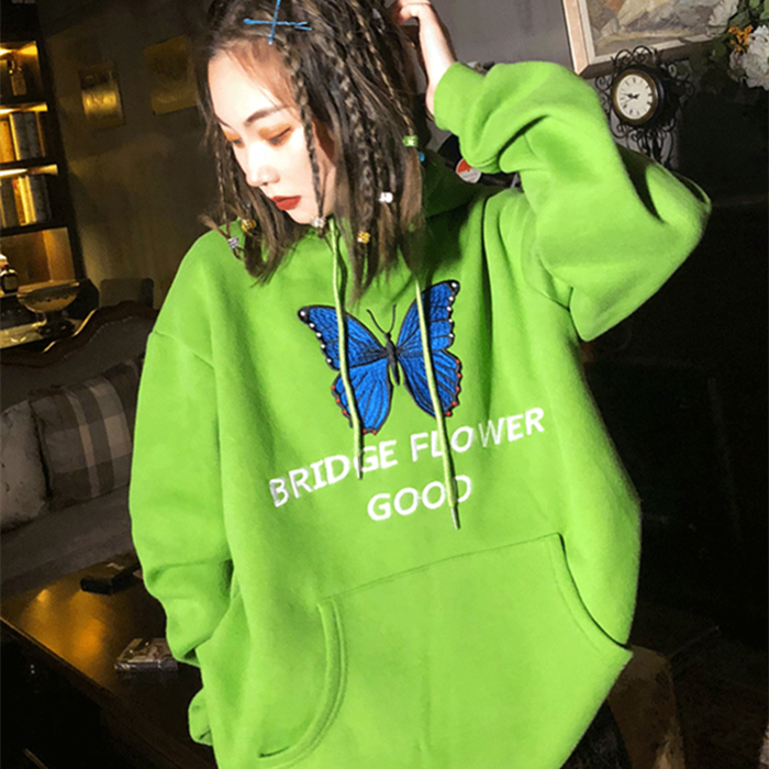 草绿色蝴蝶卫衣女慵懒风加绒加厚连帽宽松冬季