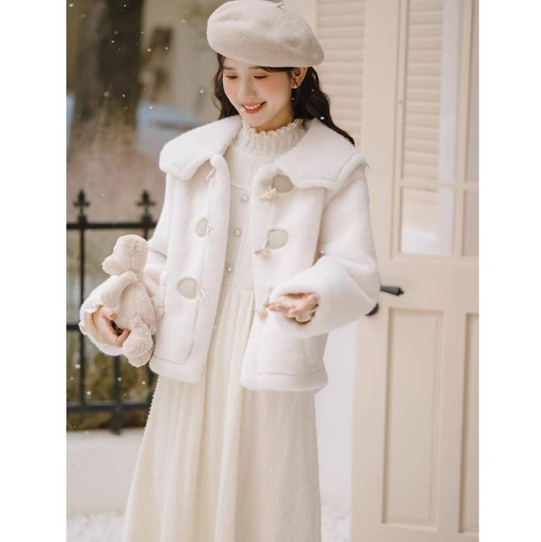 2023秋冬新甜美直筒型牛角扣外套毛绒绒保暖百搭长袖大翻领XX6405