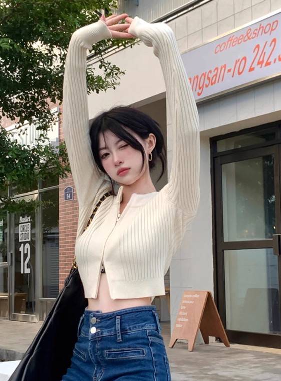 时尚辣妹修身短款长袖针织衫秋季2023新款BM显瘦拉链开衫上衣女潮