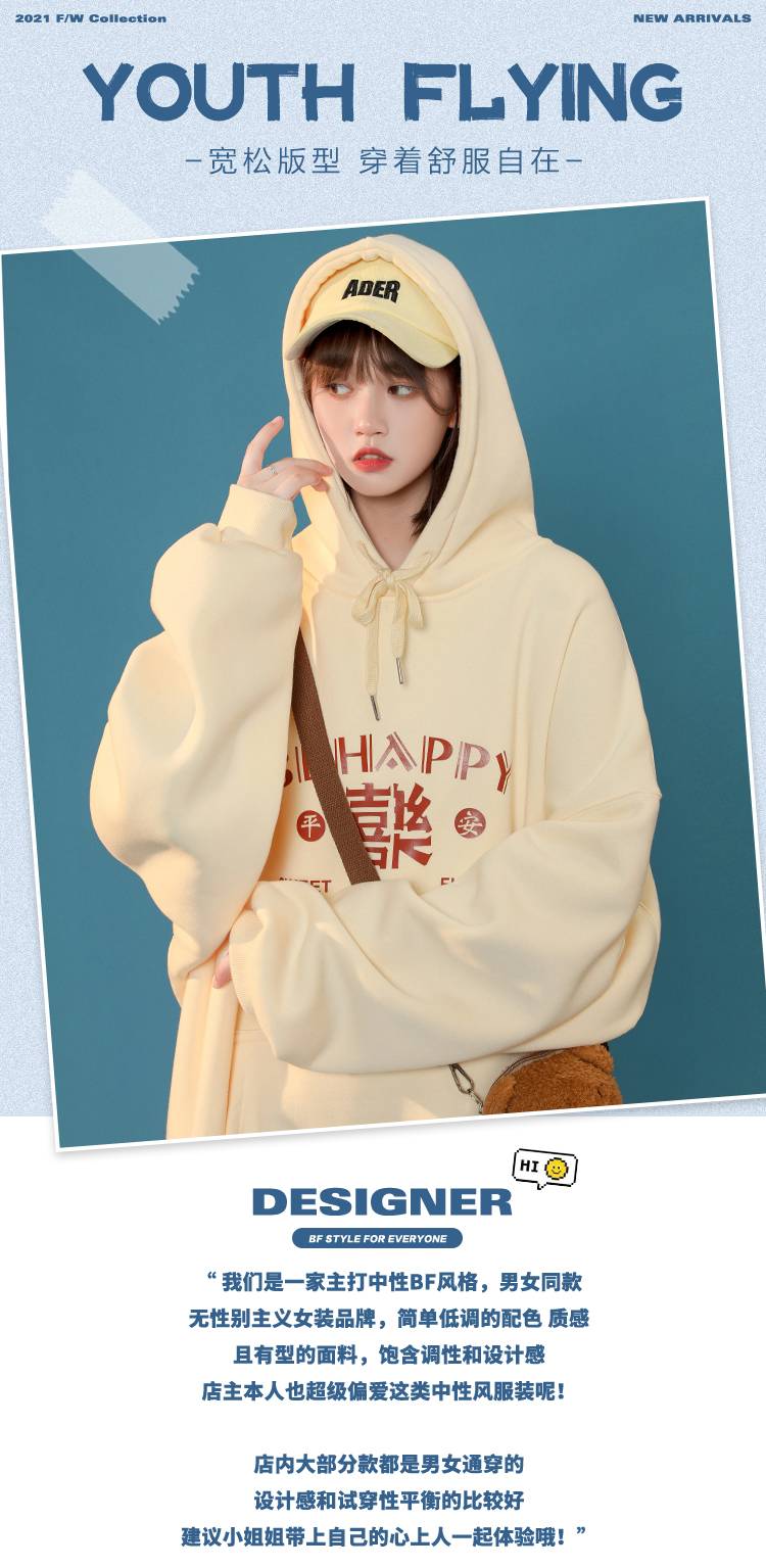 奶黄色平安喜乐秋冬新款一体绒连帽加厚加绒卫衣女冬