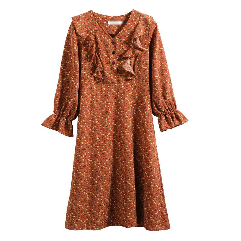 2021年秋装新款碎花雪纺连衣裙中长款收腰显瘦长袖裙子