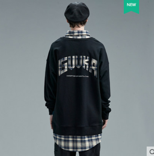 潮牌格纹拼衬衫领卫衣男中长款学生嘻哈假两件运动卫衣宽松