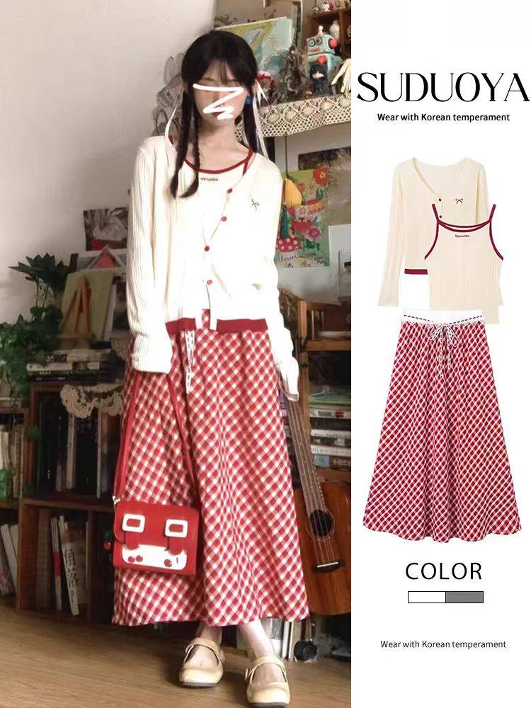 早初秋季法式红色吊带格子半身连衣裙子女2024新款减龄穿搭一整套