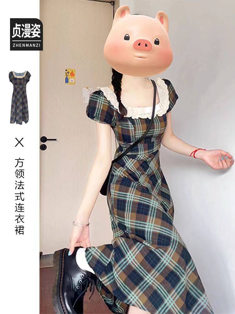 法式复古方领格子连衣裙子女夏季2024新款小个子收腰显瘦气质长裙