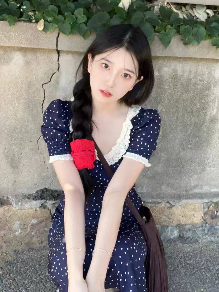 蓝色蕾丝波点连衣裙子女夏季2024年新款高级感小个子法式气质长裙