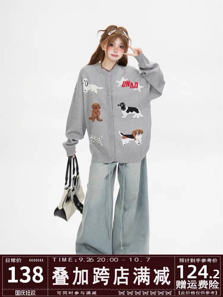 美式趣味小狗卡通灰色圆领针织开衫女春秋情侣宽松慵懒风毛衣外套