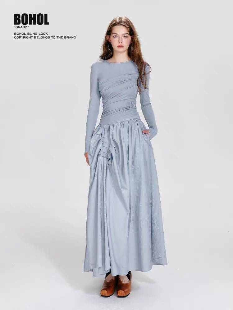 BOHOLBLING 薄荷不凉芭蕾风圆领高级感不规则抽褶长袖连衣裙