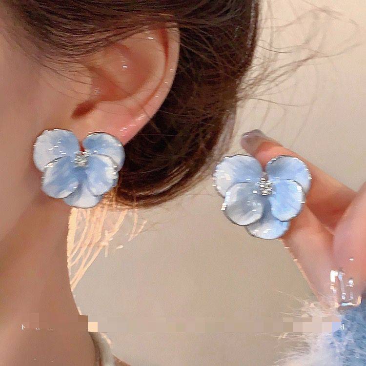 蓝色银花朵耳环耳夹小众设计复古花瓣耳钉女轻奢独特耳饰