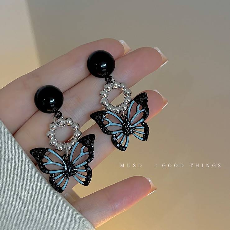 独特小众设计感黑色蝴蝶耳环甜酷耳钉冷淡风银针耳饰无耳洞耳夹女