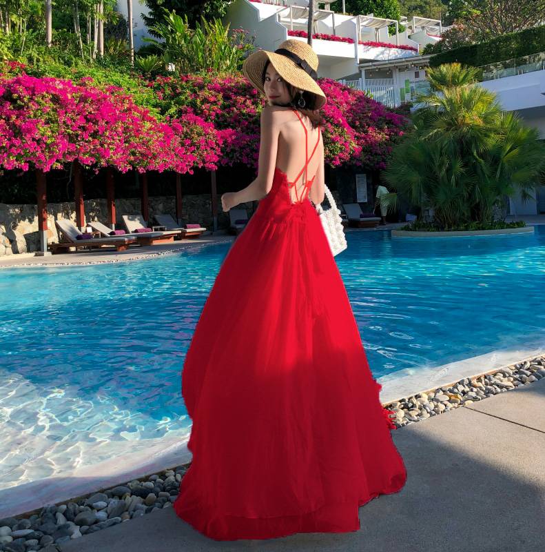 很仙的沙滩裙白色法国小众吊带漏背连衣裙女夏款海边度假ins超火
