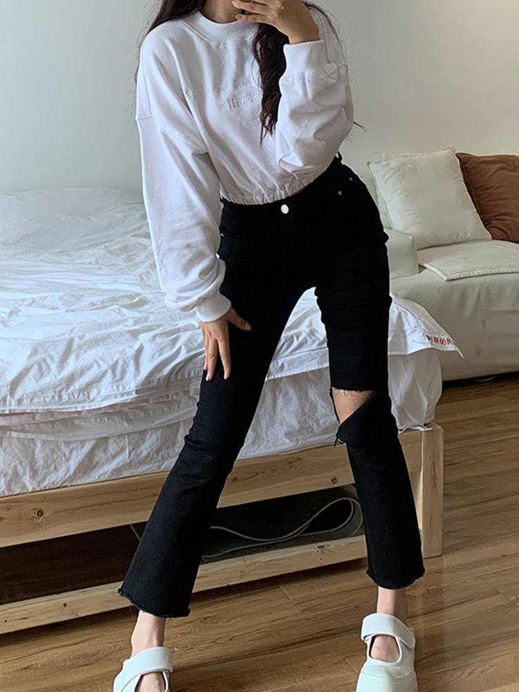 破洞牛仔裤女夏季薄款高腰微喇叭九分直筒小个子黑色裤子