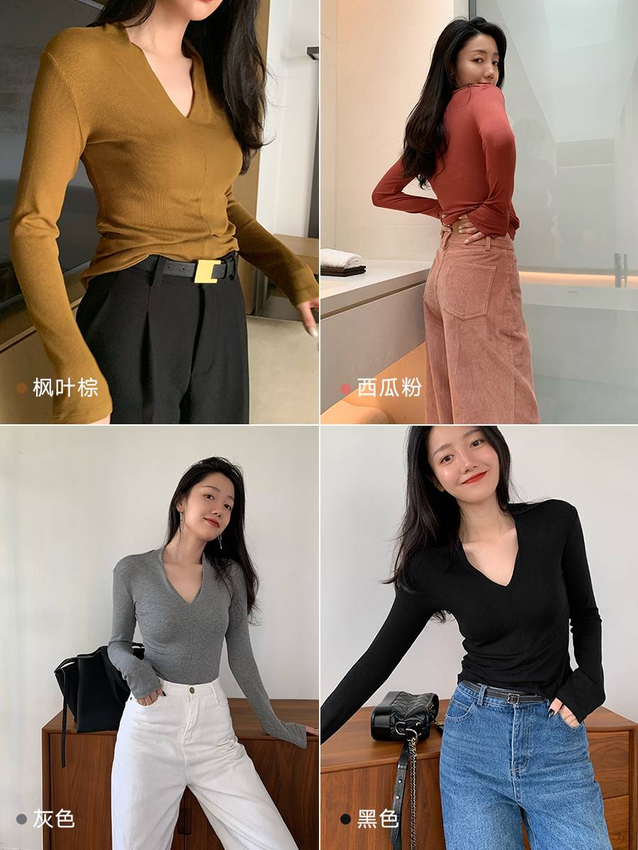 xxoossoo纯棉针织V领打底衫2020秋冬款小心机修身显瘦内搭上衣女