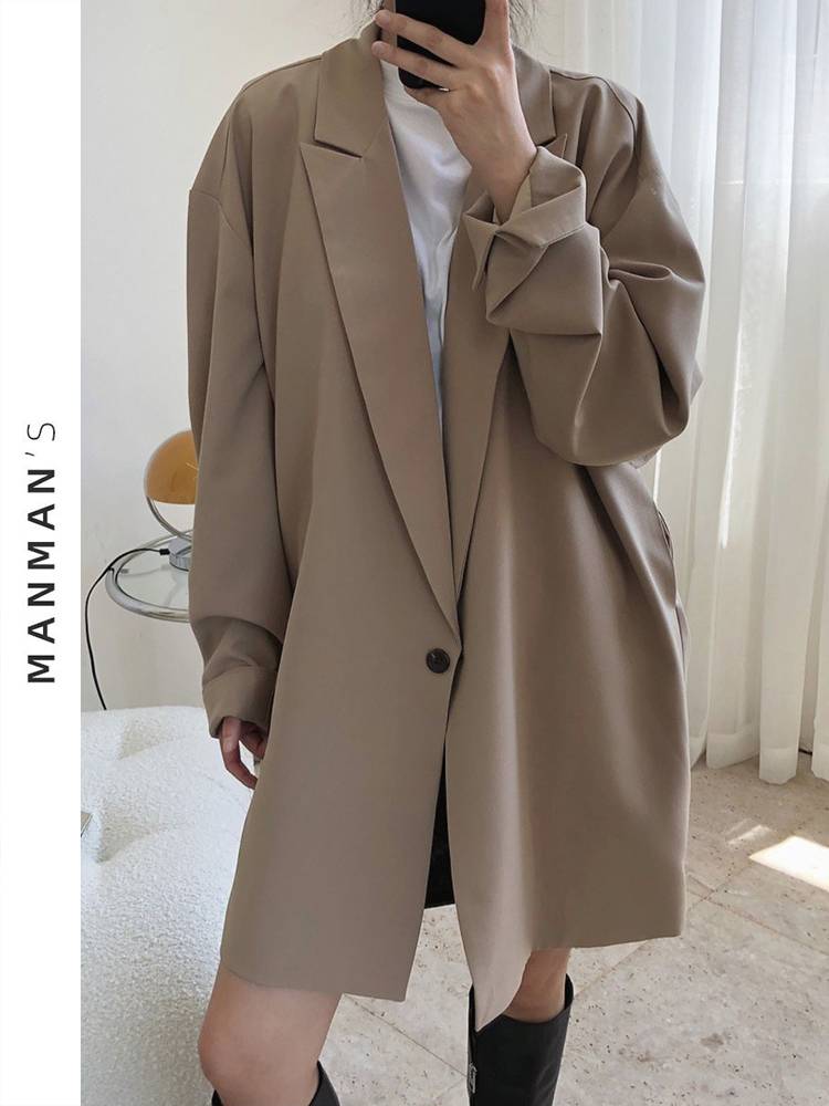 西装外套女中长款韩版宽松上衣卡其色设计感小众春秋季风衣西服女