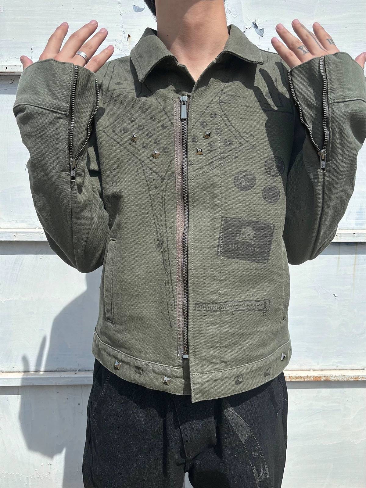 no E mosen* 涂鸦翻领朋克做旧铆钉袖口拉链水洗军绿帆布正肩夹克 428.00 已售:0件