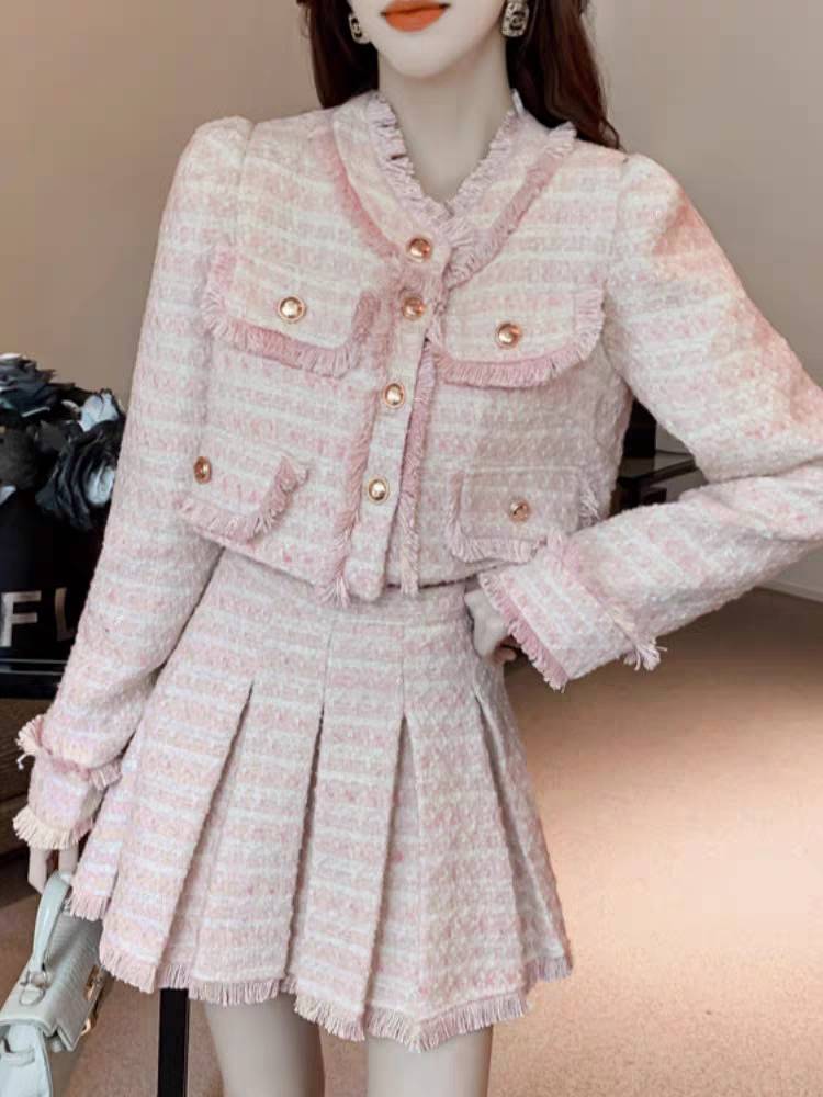 小香风加棉套装裙女秋冬装新款高级感名媛小个子气质百褶裙两件套