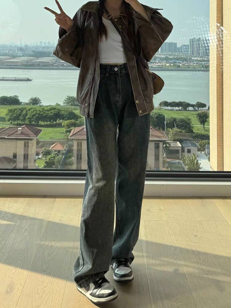 复古阔腿牛仔裤女秋冬2023年新款水泥灰美式垂感高腰宽松直筒裤子