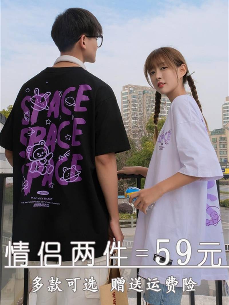 ins超火情侣装短袖卡通字母T恤女夏装韩版潮学生宽松百搭半袖上衣