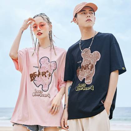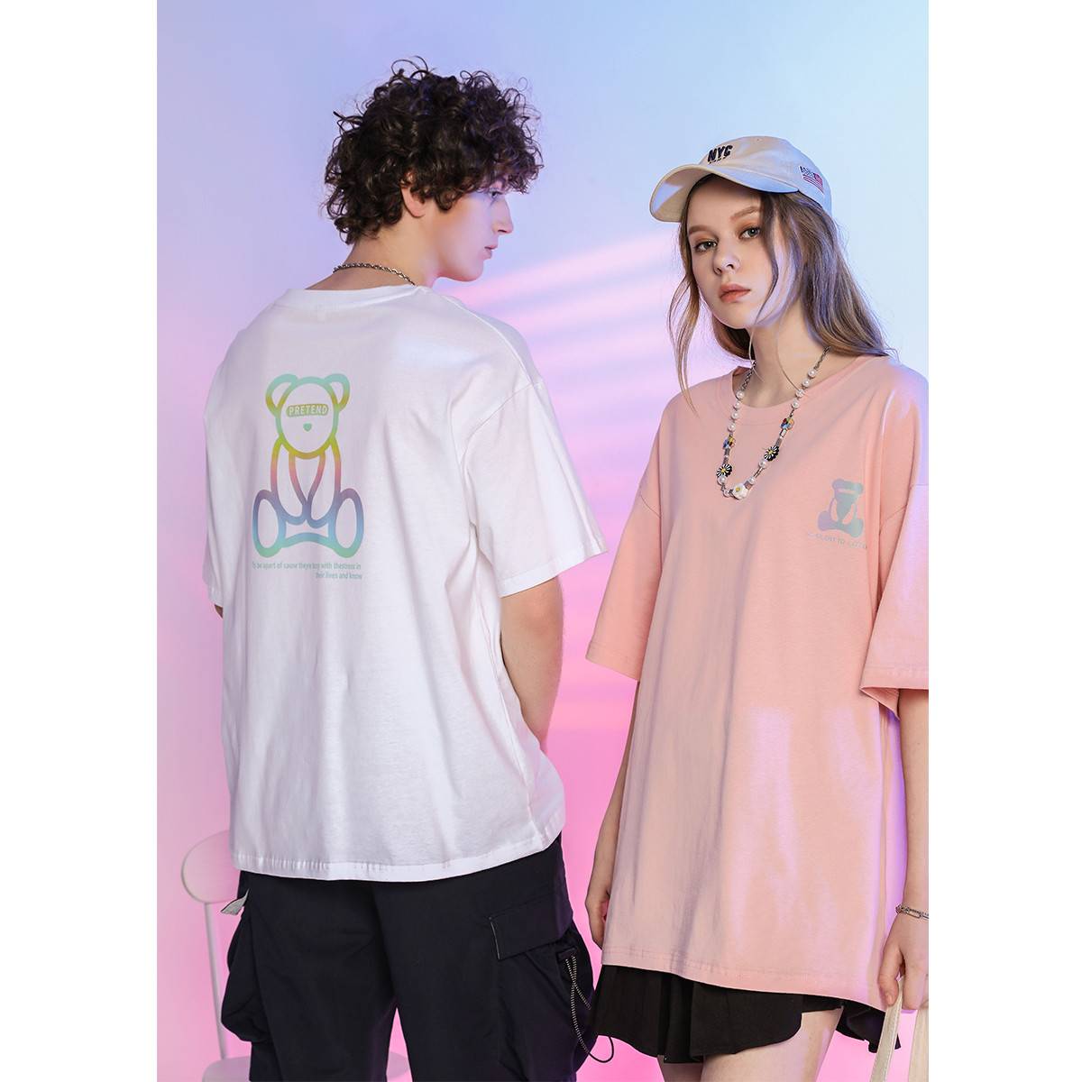 包邮 2021夏季情侣炫彩小熊印花圆领短袖落肩纯棉男式女式T恤潮 66.00 已售:0件