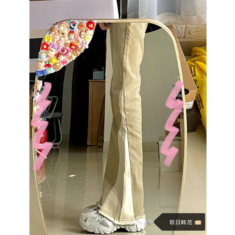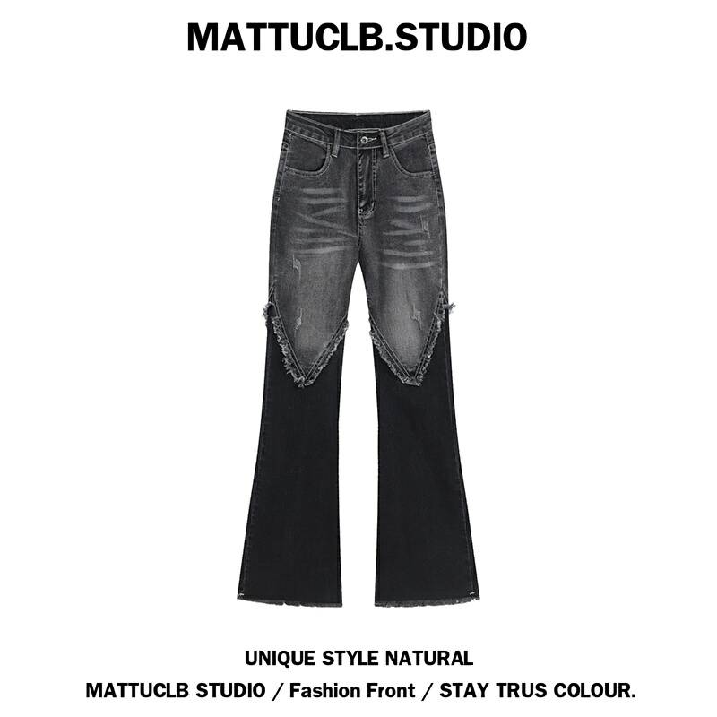 MATTUCLB 复古牛仔微喇叭裤女高腰辣妹弹力设计感毛边拼接长裤子