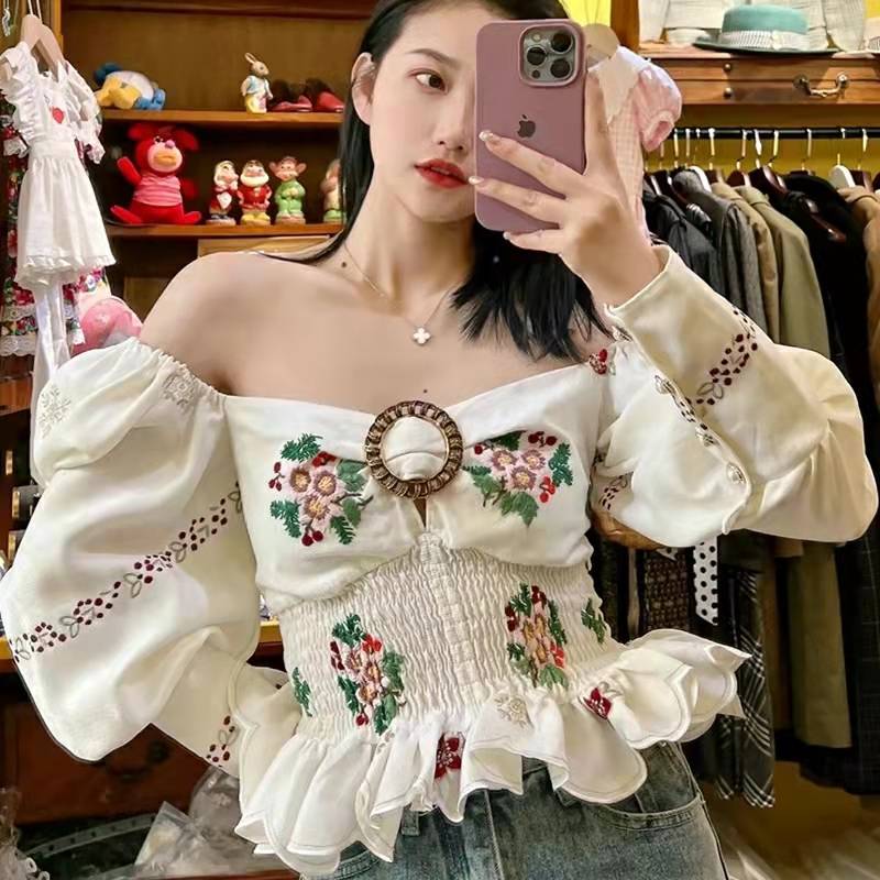 2022新款复古港风设计感一字领碎花衬衫女春季别致收腰高级感上衣