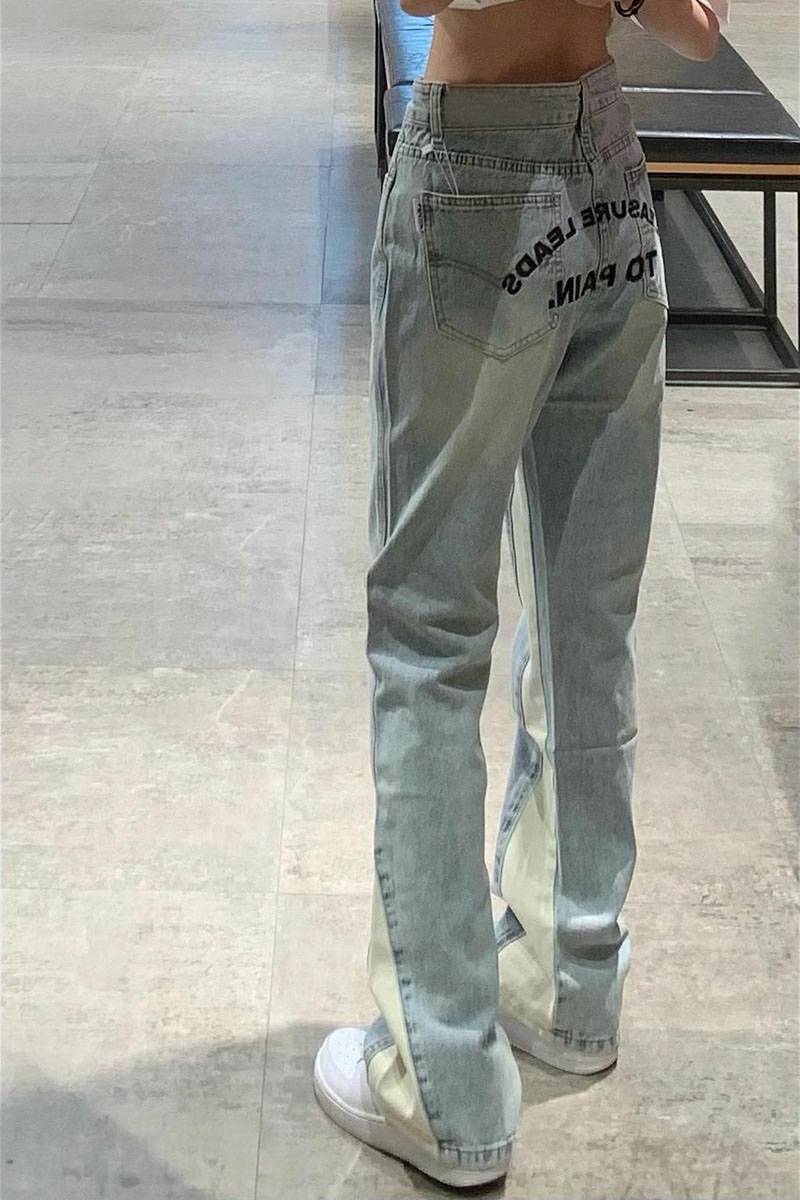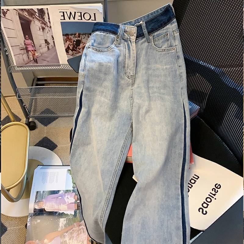 美式高街撞色牛仔裤子女春秋ins设计感小众拼接高腰直筒阔腿长裤