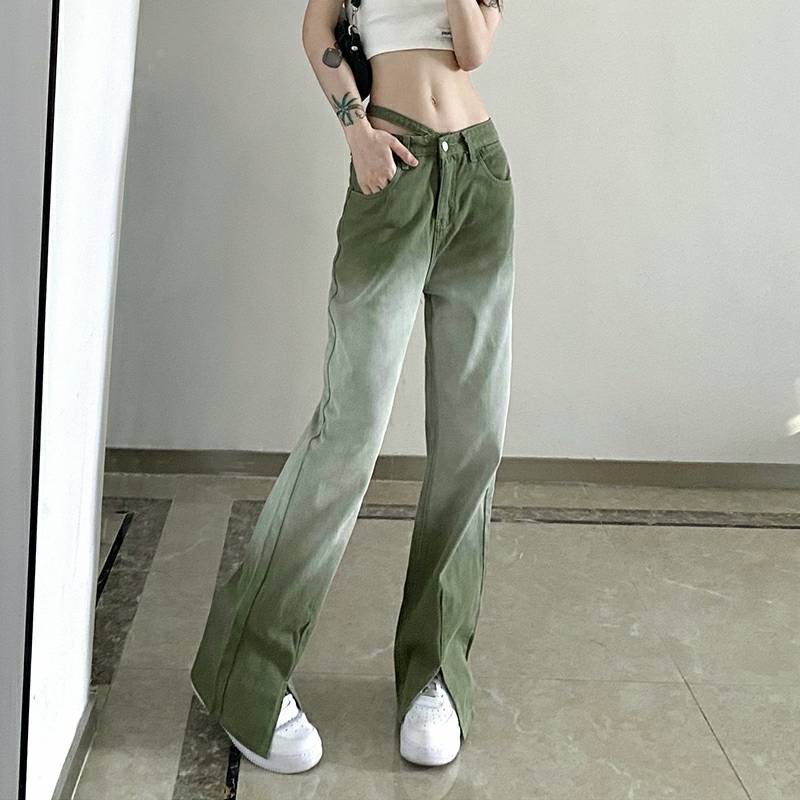 DARLINGAGA不对称高腰渐变色牛仔裤女裤脚开叉直筒宽松长裤阔腿裤