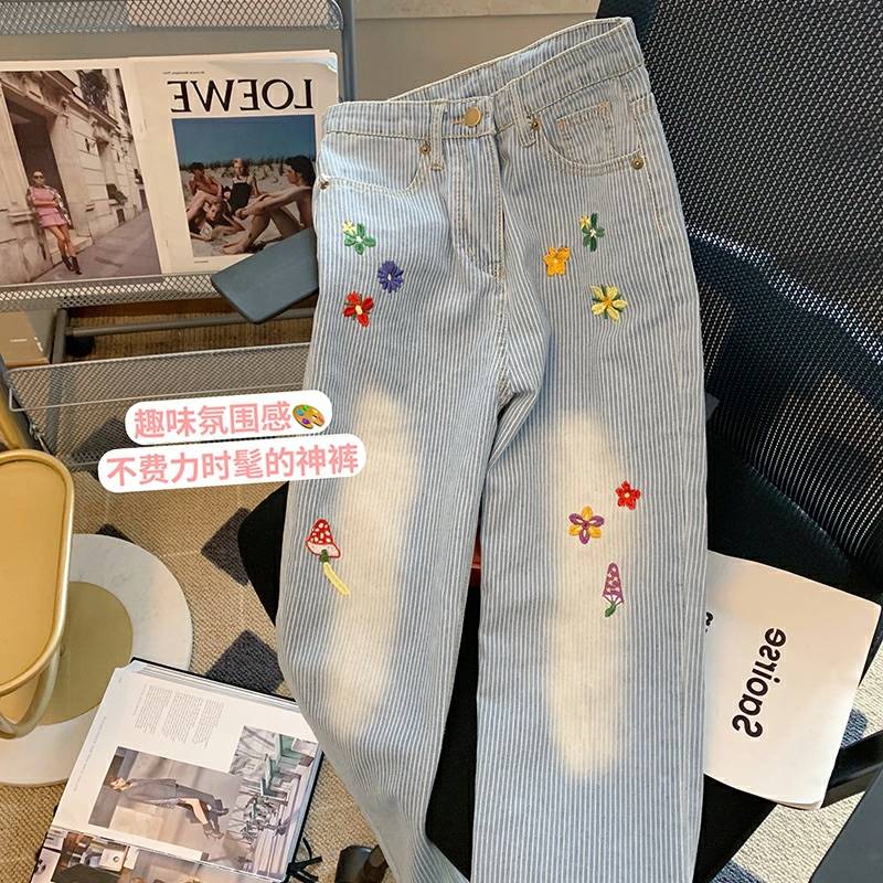 2022早春新款复古显瘦浅蓝色竖条纹裤女设计感小众刺绣花朵牛仔裤