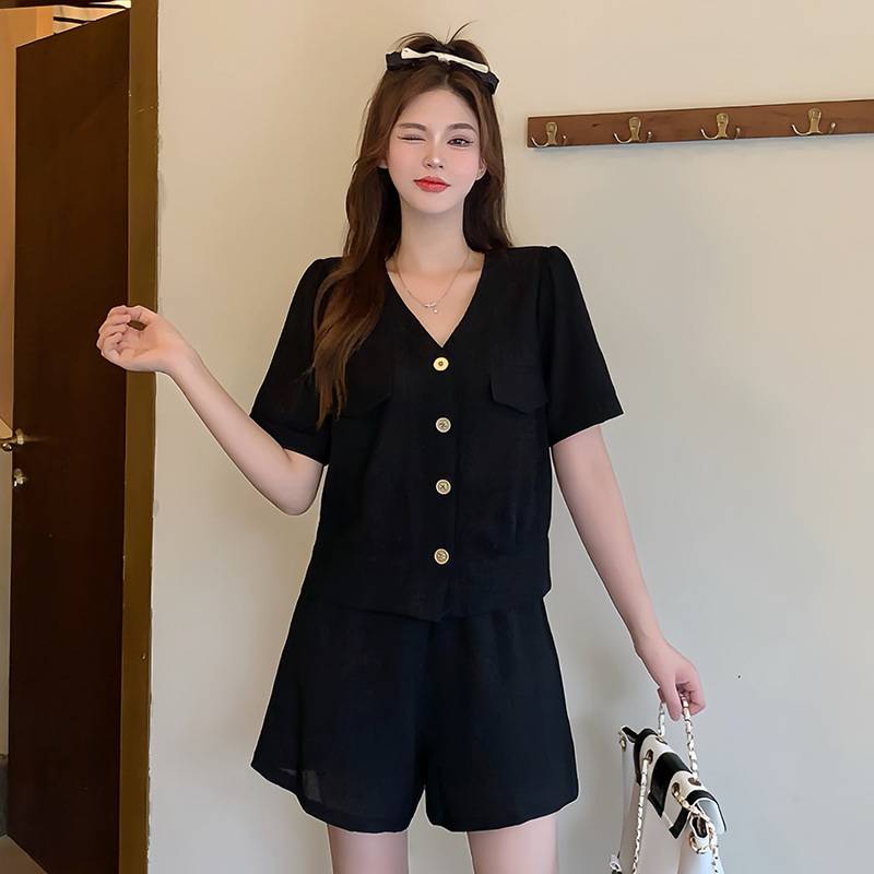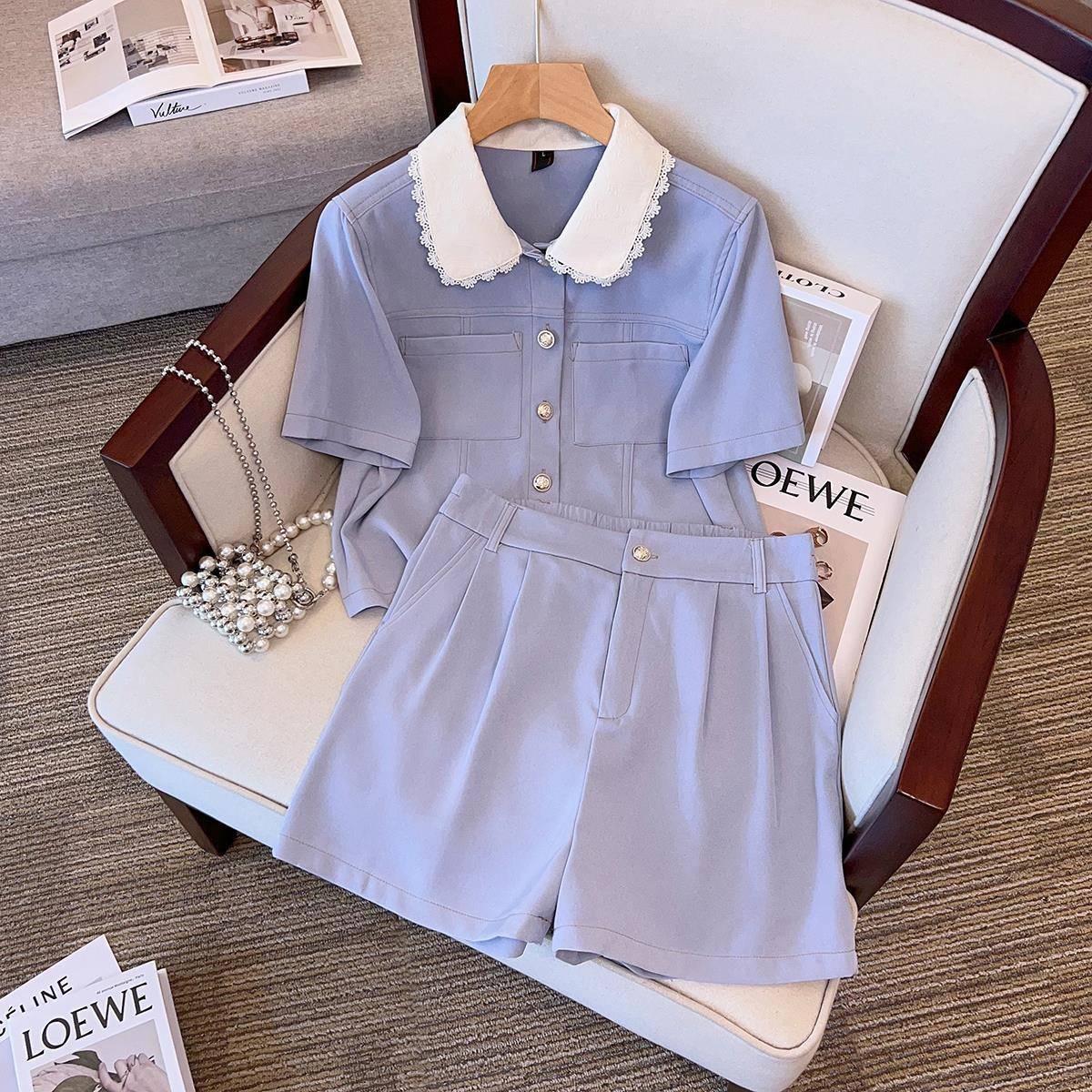 2023夏季休闲套装女胖妹妹大码时尚高级感短袖衬衣上衣短裤两件套