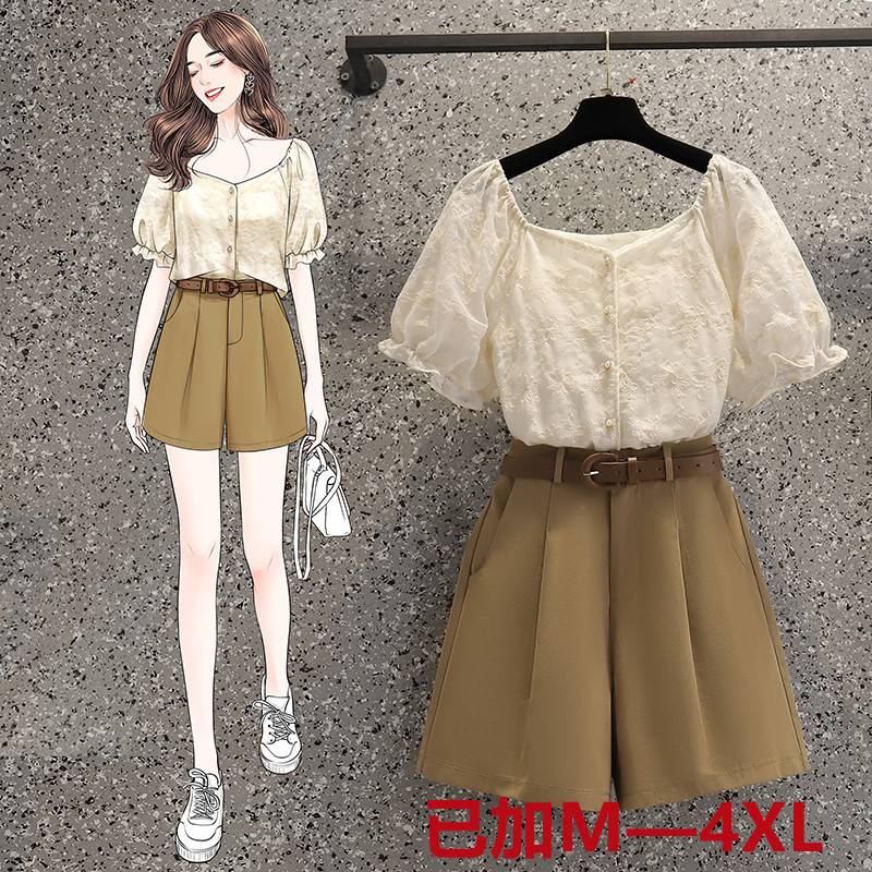 2023夏新款泡泡袖大码女装胖妹妹显瘦刺绣蕾丝上衣 阔腿短裤套装