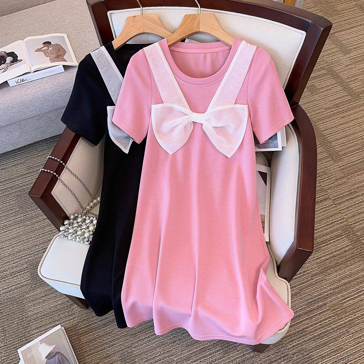 显瘦大码连衣裙女2023夏装胖MM小心机修身立体蝴蝶结休闲范T恤裙