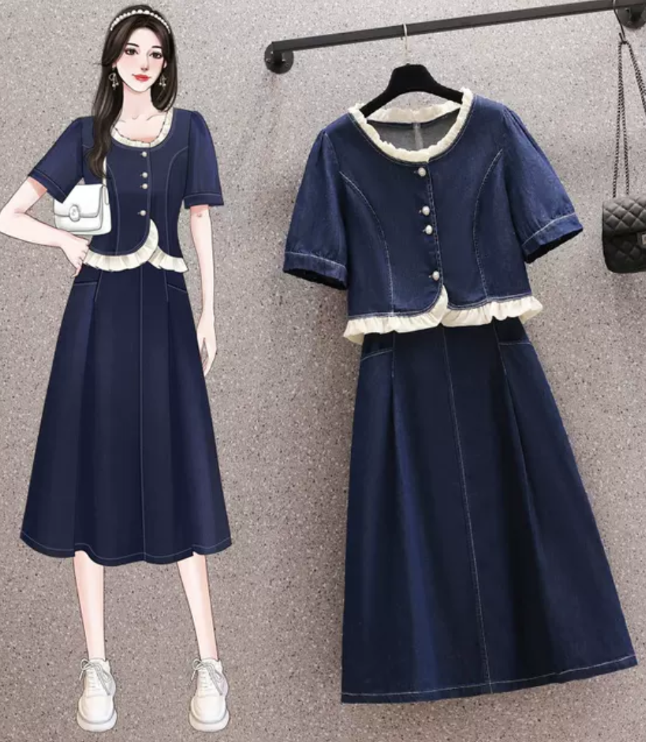 短袖大码女装2023夏新款牛仔两件套微胖mm气质木耳边上衣显瘦套装 发货