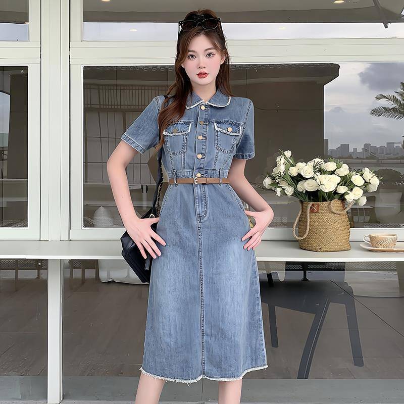 短袖大码牛仔连衣裙女2023夏装新款胖mm显瘦翻领毛毛边收腰中长裙
