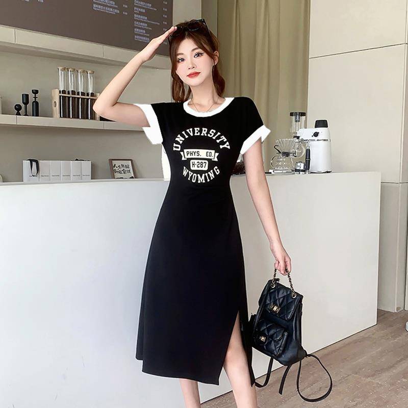 显瘦大码连衣裙2023夏装胖MM女小心机字母印花修身下摆开叉T恤裙