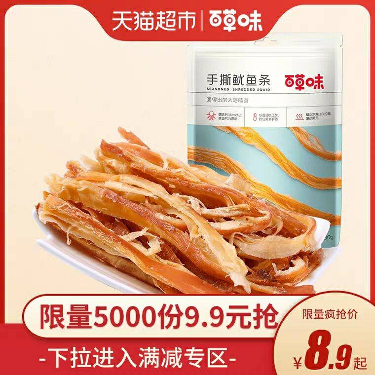 百草味手撕鱿鱼条80g 休闲零食鱿鱼丝海味小吃即食海鲜特产 包邮