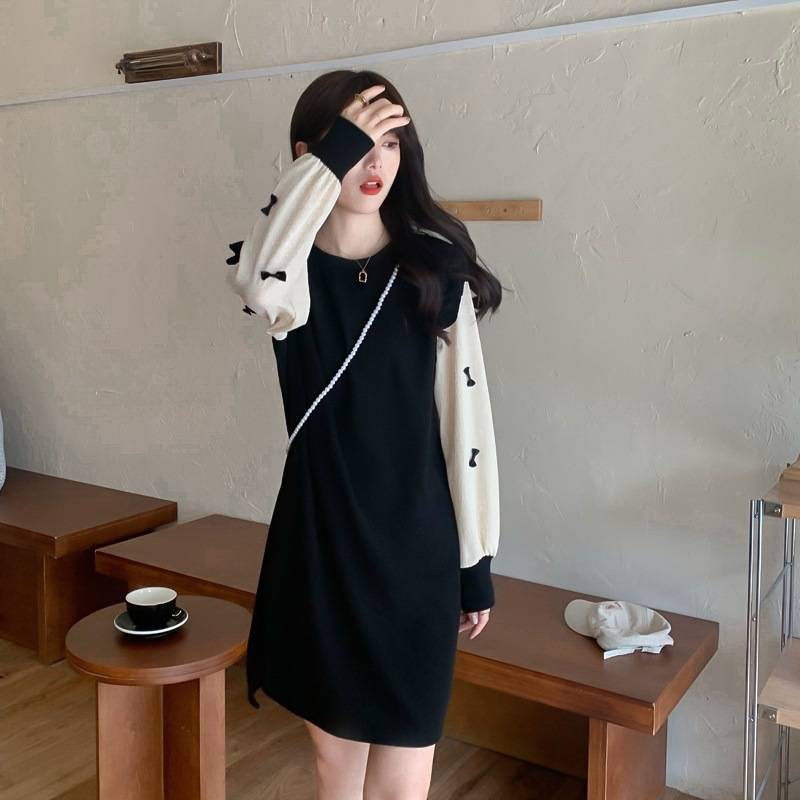 设计感甜美可爱蝴蝶结假两件2021新款百搭泡泡袖拼接连衣裙潮