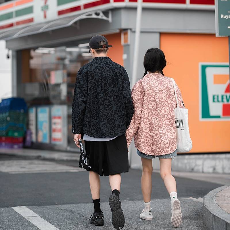 日系复古小熊满印长袖工装衬衫男女潮牌宽松休闲情侣装衬衣薄外套