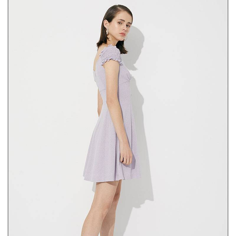 尼尔尼尔春夏新品甜美一字肩显瘦抽褶木耳边单排扣连衣裙