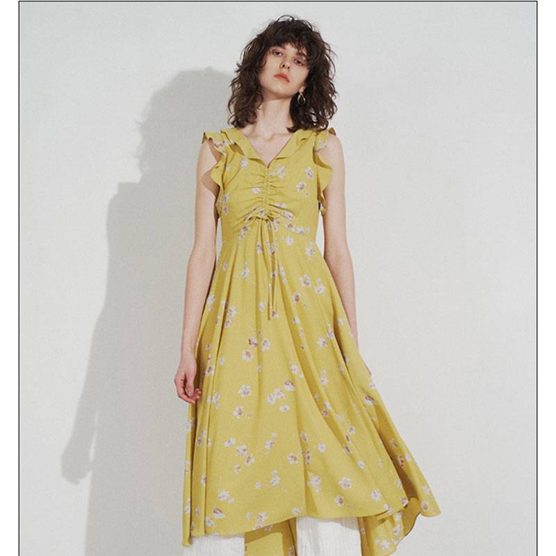 尼尔尼尔春夏新品法式浪漫印花荷叶边抽绳修身气质连衣裙