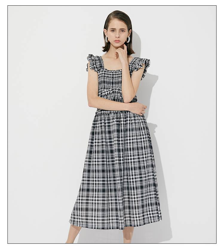 春夏新品 少女格纹抽褶收腰吊带飞袖连衣裙显瘦少女裙子及膝