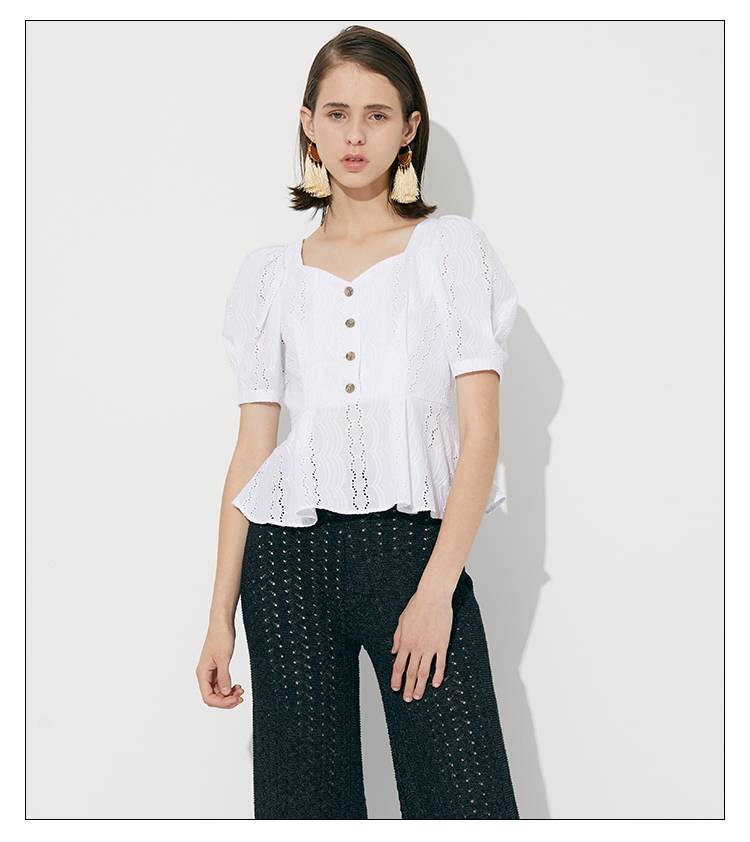 2019春夏新品 甜美宫廷风泡泡袖纽扣V领蕾丝上衣