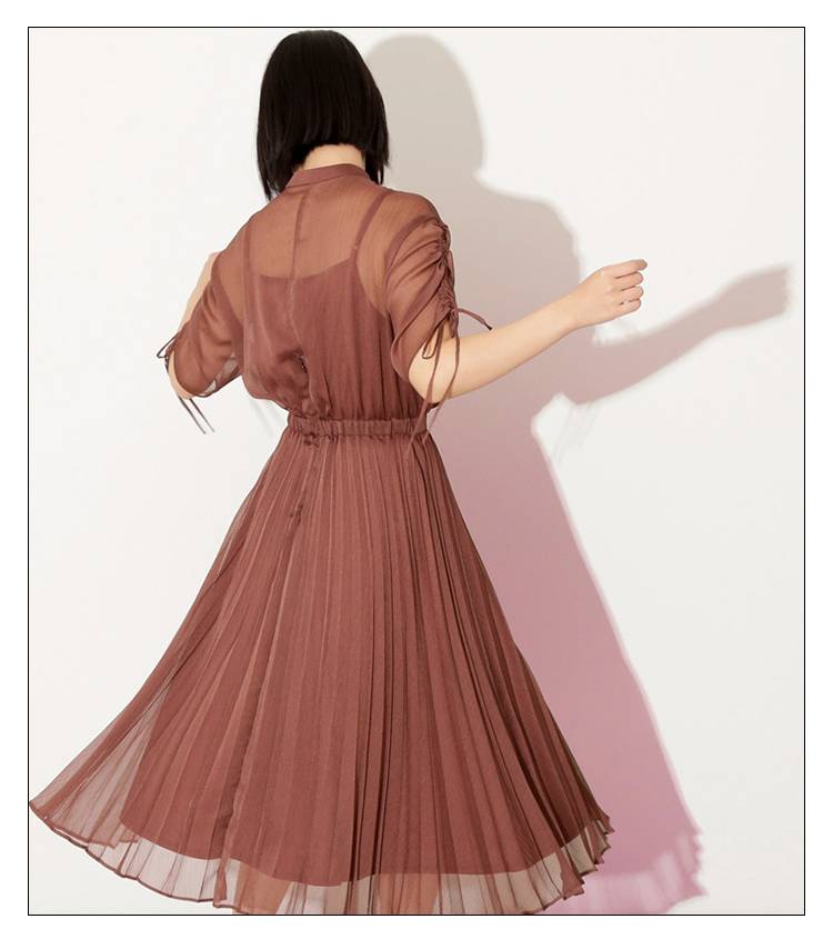 2019春夏新品优雅透视感抽绳流苏百褶雪纺连衣裙