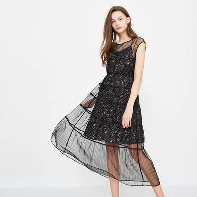 尼尔尼尔夏季新款网纱外搭假两件印花连衣裙